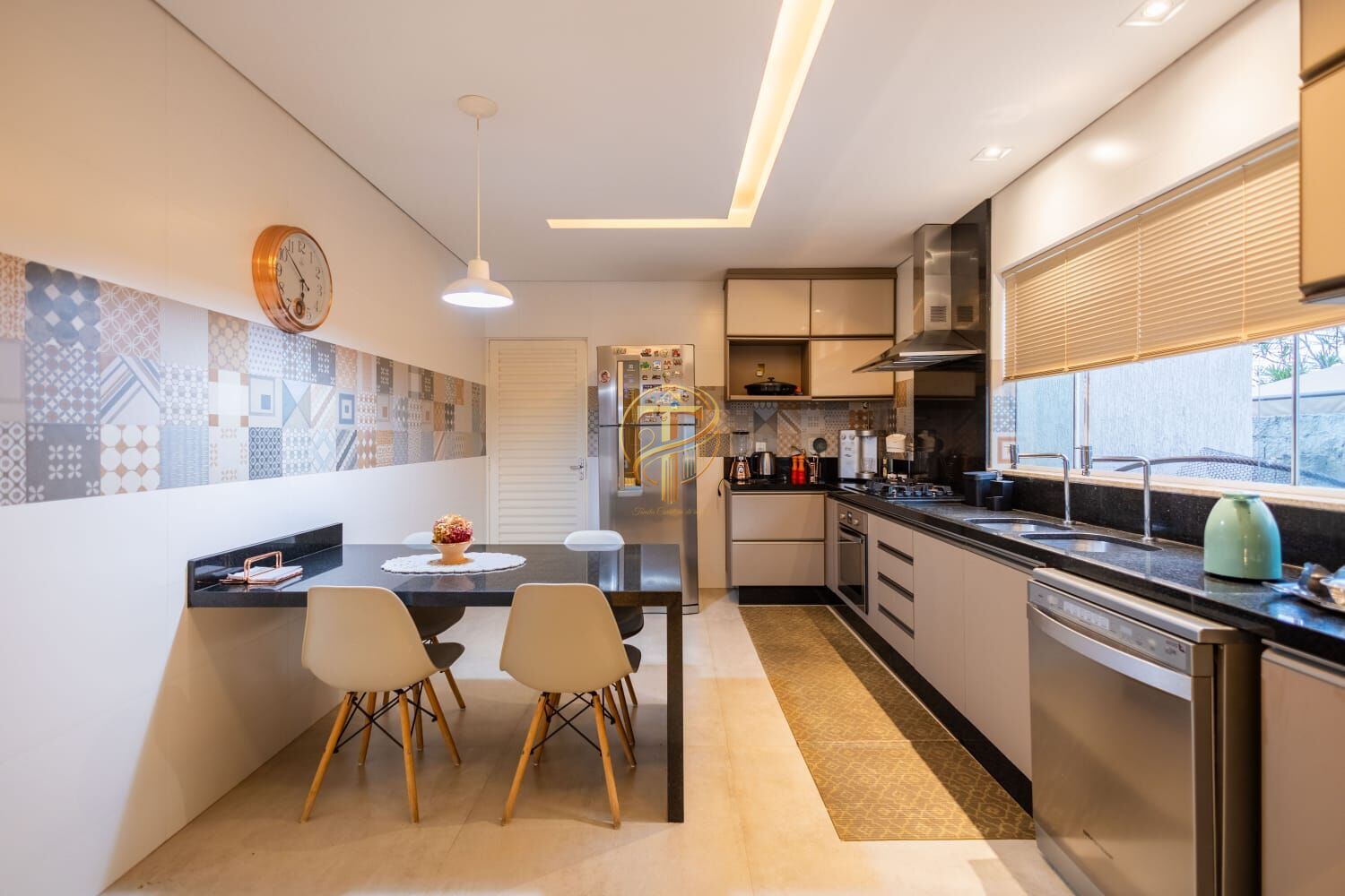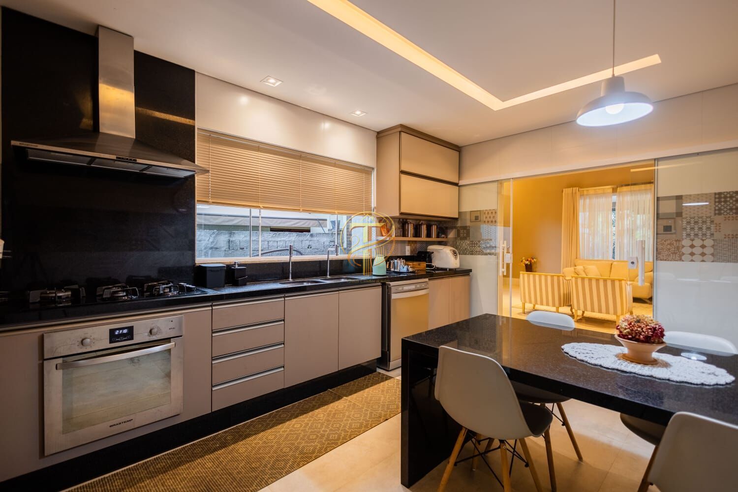 - Cozinha Com armários planejados, Forno , Cooktop, Coifá e lava louças, mesa em marmore com 4 cadeiras